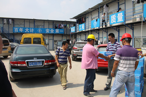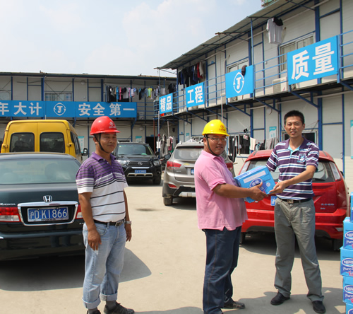 為一線員工送清涼 時間:2013-07-29 5055 驕陽似火,熱浪滾滾,持續近一個月的高溫天氣給工程正常施工帶來了很大的影響,奮戰在烈日炎炎下的一線員工的身體狀況時刻牽動著公司領導的心。7月29日,上海室外溫度更是超過40度,江蘇華建副總經理、上海分公司總經理楊杰特地委托總工程師魏春明、工會副主席陳德權等同志赴由公司承建的上海楓葉國際學校工地看望一線作業人員,為員工送去了礦泉水、毛巾等清涼慰問品,并叮囑要注意避開高溫作業時段,保護身體,確保夏季施工生產安全。