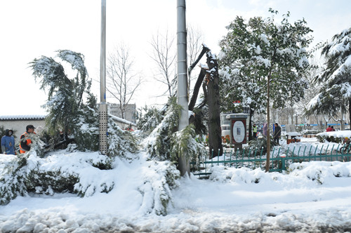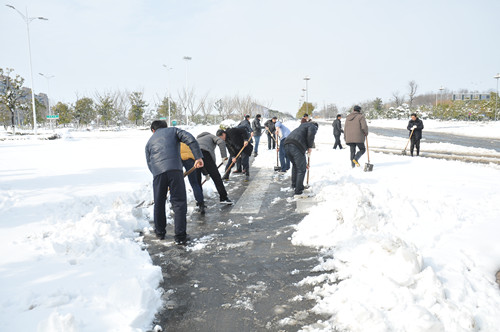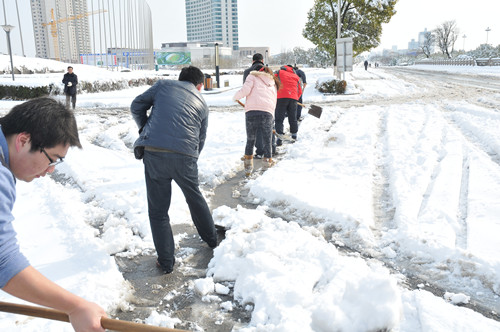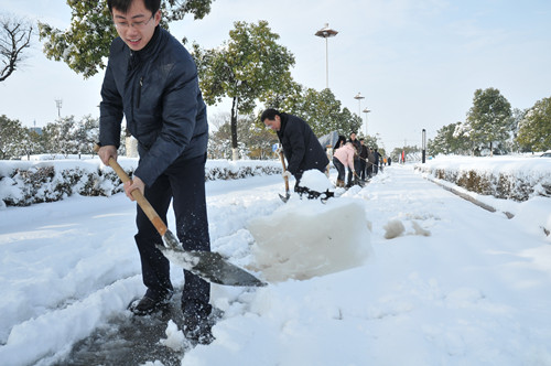 公司總部組織員工上路清掃積雪 時間:2013-02-19 3923 2月18日至19日凌晨,揚州出現低溫降雪災害天氣,降下了多年罕見的一場大雪,壓垮樹枝和部分房屋設施,并造成道路交通不便。19日清晨,公司響應市政府號召,組織20余名員工上路清掃積雪,公司領導吳士茂、錢啟明親自參加,與大家共同會戰2個多小時,完成了清掃任務。 厚重的積雪壓垮樹枝
