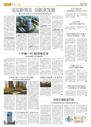 2月13日《揚(yáng)州日報》C3整版刊發(fā)“揚(yáng)州建工”專版,主要包括《適應(yīng)新常態(tài) 創(chuàng)新求發(fā)展——建工控股系統(tǒng)2014年逆市奮進(jìn)再創(chuàng)新佳績》、《華建地產(chǎn)著力打造本土高尚樓盤》、江蘇華建再獲“全國建筑業(yè)先進(jìn)企業(yè)”稱號等內(nèi)容,歡迎關(guān)注當(dāng)日《揚(yáng)州日報》或網(wǎng)站http://www.yznews.com.cn/yzrb/html/2015-02/13/node_199.htm。