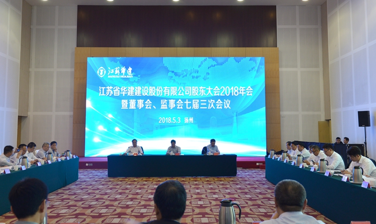 5月3日下午,江蘇華建股東大會2018年會暨董事會監事會七屆三次會議在揚州召開。公司股東單位代表和董事、監事出席會議,公司高級管理人員、各分支機構和總部各部室負責人、律師團律師列席會議,王宏董事長主持會議,揚州市政府副秘書長林寶榮出席會議并致辭。