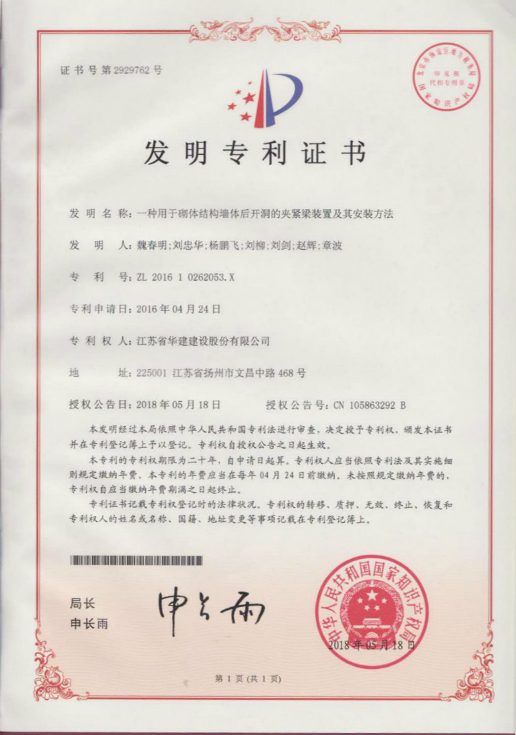 上海分公司發布的《一種用于砌體結構墻體后開洞的夾緊梁裝置及其施工方法》(專利號:ZL201610262053.X)獲得發明專利授權。