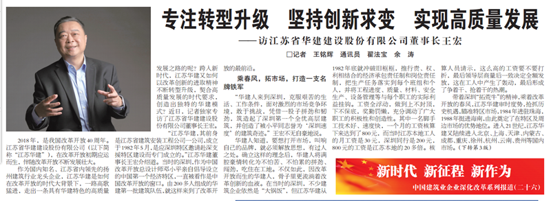 王宏董事長接受《建筑時報》專訪:專注轉(zhuǎn)型升級,堅持創(chuàng)新求變,實現(xiàn)高質(zhì)量發(fā)展 時間:2018-09-11 3863 9月10日,《建筑時報》頭版及微信公眾號對王宏董事長的專訪給予了刊載。 王宏董事長在專訪中就江蘇華建成立36年來,是如何在改革開放的時代大背景下,走出一條具有華建特色的高質(zhì)量發(fā)展之路,跨入新時代,江蘇華建又是如何以改革創(chuàng)新的進(jìn)取精神不斷轉(zhuǎn)型升級,契合高質(zhì)量發(fā)展的時代要求,創(chuàng)造出獨特的華建模式進(jìn)行了詳細(xì)介紹。