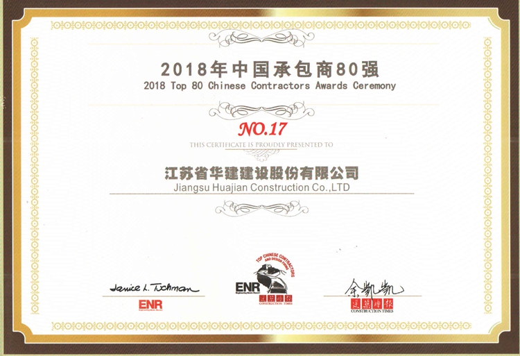 11月8日,由美國《工程新聞記錄》(簡稱ENR)和中國《建筑時報》主辦的2018年“中國承包商80強(qiáng)和工程設(shè)計企業(yè)60強(qiáng)”排名正式揭曉,江蘇華建再次入選中國承包商80強(qiáng)榜單,列第17位。