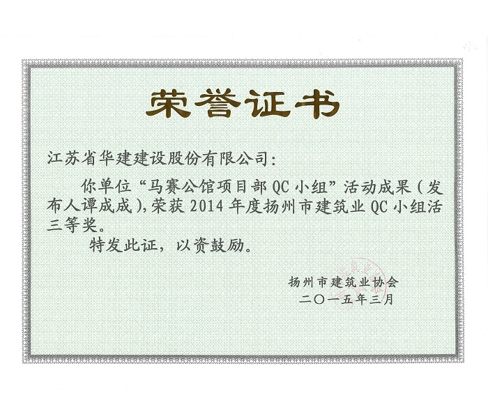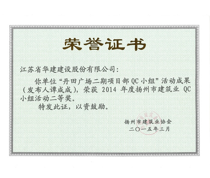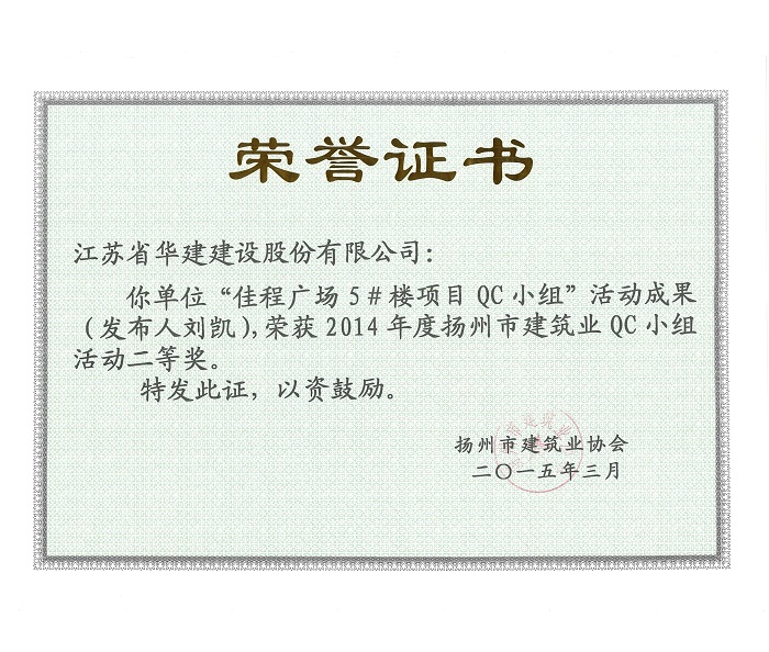 公司5項成果獲揚州市建筑業QC成果獎 時間:2015-03-31 4786 近日,揚州市建筑業協會發文表彰了2015年度全市建筑業QC小組活動成果獎,公司共有5項成果獲獎,其中,“孔令正QC小組”活動成果《剝蝕丘陵地貌多形截面鋼筋混凝土灌注樁施工新方法》榮獲一等獎,“佳程廣場5#樓項目QC小組”活動成果《提高核心筒筒體結構施工質量》、“重慶佳程廣場項目部QC小組”活動成果《提高現澆混凝土樓梯結構施工質量》、“丹田廣場二期項目部QC小組”活動成果《提高蒸壓加氣混凝土砌塊外墻合格率》榮獲二等獎,“馬賽公館項目部QC小組”活動成果《 提高耐磨金剛砂地面施工質量》榮獲三等獎。