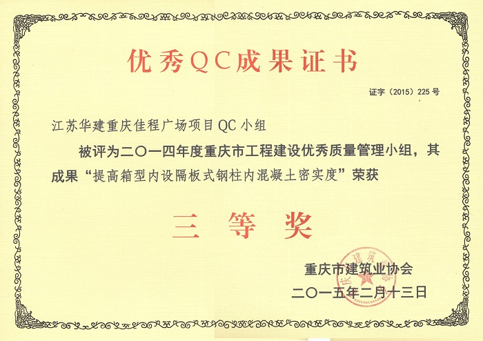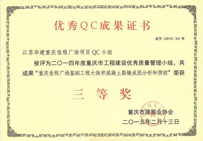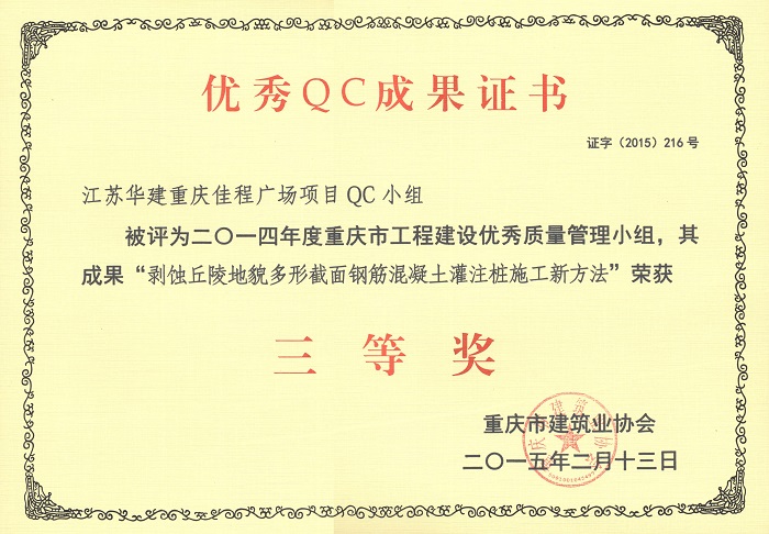 公司3項QC成果榮獲重慶市三等獎 時間:2015-04-02 4657 近日,重慶市建筑業協會發文表彰了一批優秀QC成果,公司重慶佳程廣場項目QC小組被評為2014年度重慶市工程建設優秀質量管理小組,其成果“提高箱型內設隔板式鋼柱內混凝土密實度”、“剝蝕丘陵地貌多形截面鋼筋混凝土灌注樁施工新方法”、“重慶佳程廣場基礎工程大體積混凝土裂縫成因分析和預控”等均榮獲三等獎。