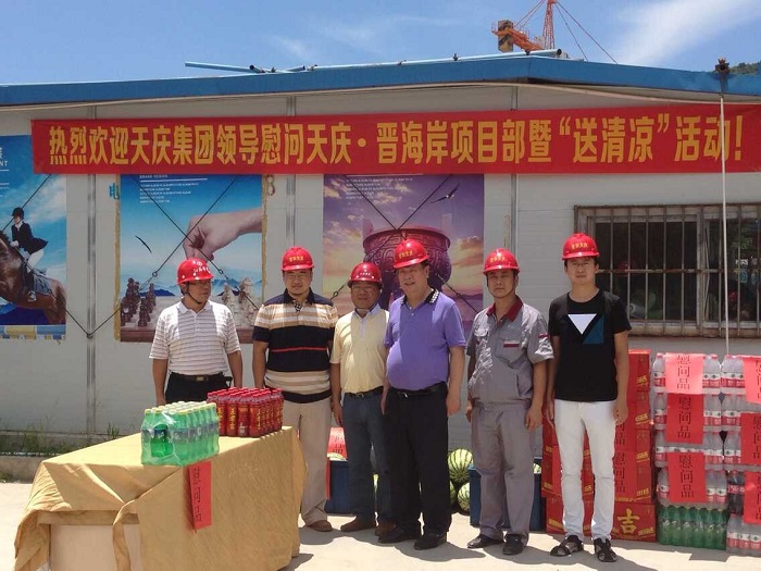 千里送清涼——天慶集團(tuán)董事長(zhǎng)韓慶慰問(wèn)我司一線職工 時(shí)間:2015-08-05 4105 8月4日中午,烈日當(dāng)空,驕陽(yáng)似火。甘肅天慶房地產(chǎn)集團(tuán)有限公司董事長(zhǎng)韓慶一行不遠(yuǎn)千里來(lái)到廣東珠海,頂著烈日,冒著酷暑,在項(xiàng)目負(fù)責(zé)人陳建的陪同下,慰問(wèn)我司承建的“天慶·晉海岸”項(xiàng)目一線施工人員,給工人們送來(lái)了西瓜、礦泉水、王老吉等飲品和深情問(wèn)候,讓廣大一線職工在炎炎烈日下感受到陣陣清涼。