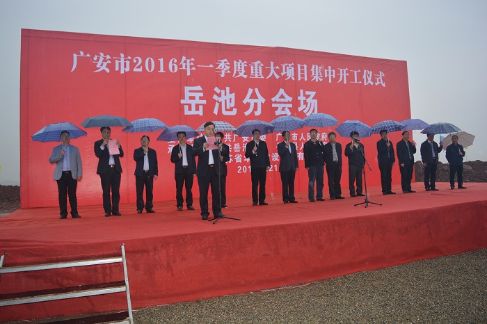 3月21日上午,廣安市2016年一季度重大項目集中開工儀式岳池分會場在岳池城東新區隆重舉行,以公司岳池城東新區基礎設施、智慧城市及海綿城市建設PPP項目為代表的一批項目正式開工建設。廣安市委常委、組織部長黃秀川、副市長席世洪,岳池縣委副書記、縣長湯才勇等領導,廣安市住建、交通、水務等部局負責人,岳池縣人大、政協及縣住建、發改等多個部局負責人出席活動。岳池縣委常委、常務副縣長鐘愛平主持儀式。