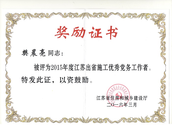 重慶分公司被表彰為“2015年度江蘇出省施工先進企業” 時間:2016-04-20 2953 近日,重慶分公司被江蘇省住房和城鄉建設廳表彰為“2015年度江蘇出省施工先進企業”,重慶分公司總經理嚴正濤榮獲“2015年度江蘇出省施工優秀企業經理”稱號,樊晨亮被評為“2015年度出省施工優秀黨務工作者”。