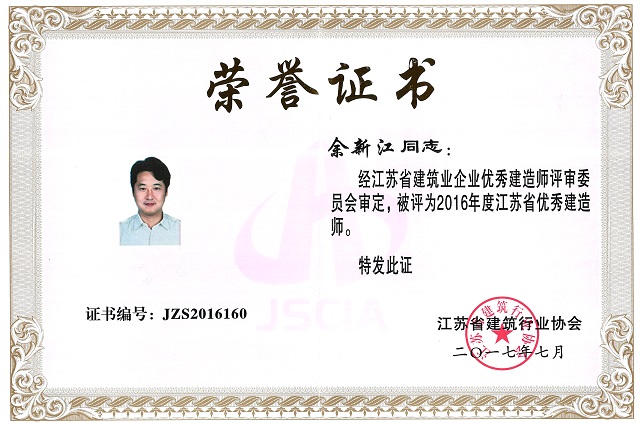 公司1位同志被授予“江蘇省優(yōu)秀建造師”榮譽稱號 時間:2017-12-12 3886 日前,江蘇省建筑行業(yè)協(xié)會下發(fā)了《關于2016年度江蘇省建筑業(yè)優(yōu)秀建造師的決定》,公司余新江同志位列榜單,榮獲表彰,被授予“江蘇省優(yōu)秀建造師”榮譽稱號。