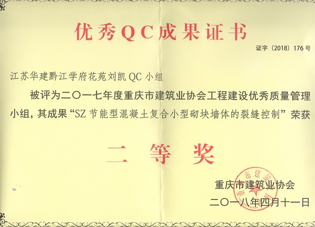近日,重慶市建筑業(yè)協(xié)會發(fā)文表彰了一批優(yōu)秀QC成果,江蘇華建黔江學(xué)府花苑劉凱QC小組被評為2017年度重慶市工程建設(shè)優(yōu)秀質(zhì)量管理小組,其成果“SZ節(jié)能型混凝土復(fù)合小型砌塊墻體的裂縫控制”榮獲二等獎。
