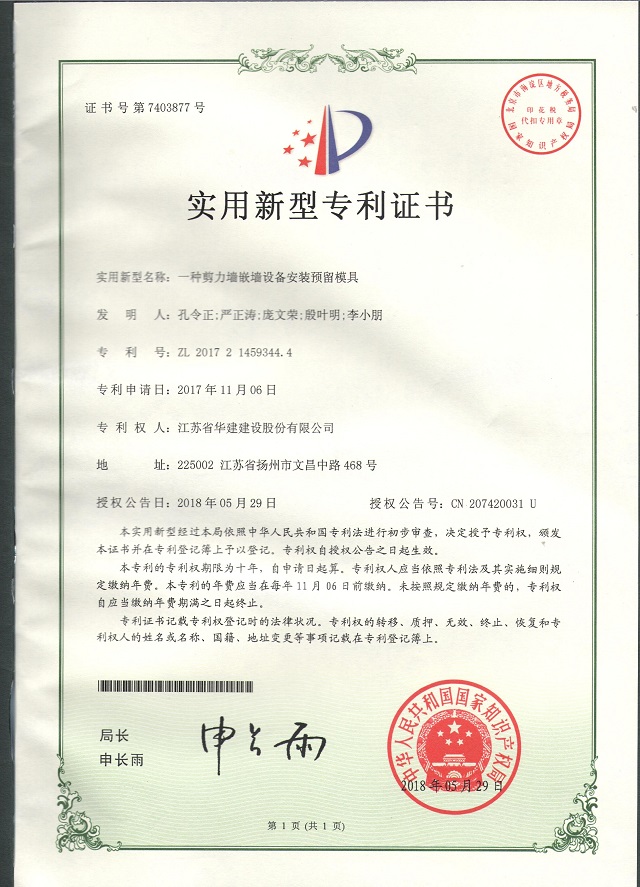近日,從國家知識(shí)產(chǎn)權(quán)局傳來喜訊,公司申請(qǐng)的《一種剪力墻嵌墻設(shè)備安裝預(yù)留模具》獲得實(shí)用新型專利授權(quán)。