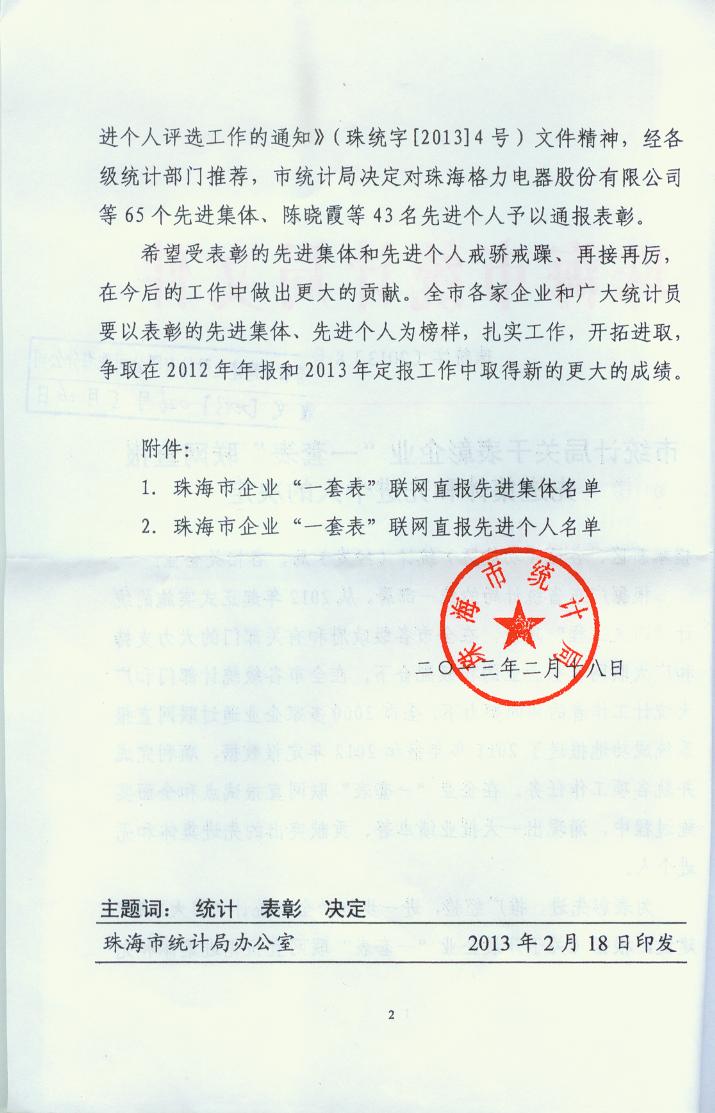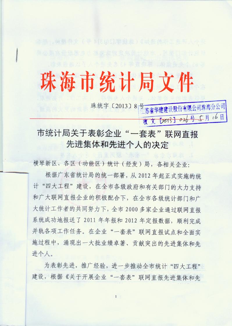 2013年珠海市統計局一套表聯網直報工作先進單位