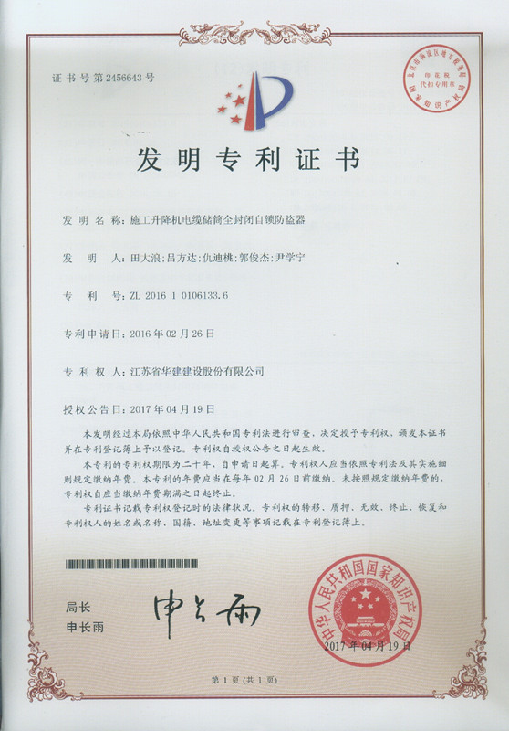 日前,公司又一項發(fā)明專利獲得國家知識產(chǎn)權(quán)局授權(quán),此項專利名稱為“施工升降機(jī)電纜儲筒全封閉自...