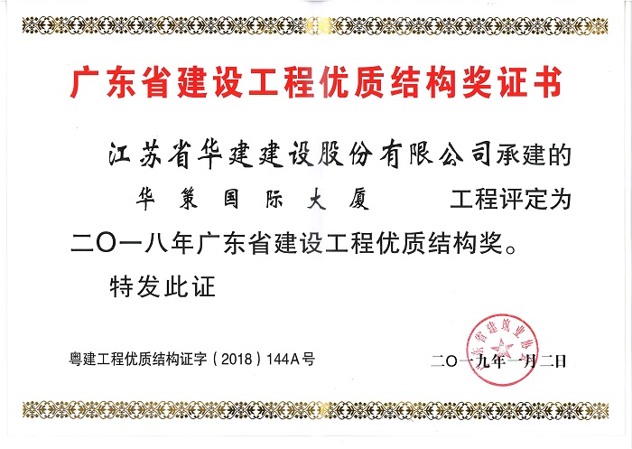 華策國際大廈獲2018年廣東省建設工程優質結構獎