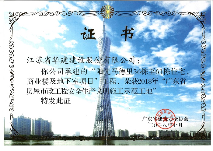 陽光馬德里獲2018年廣東省房屋市政工程安全生產文明施工示范...