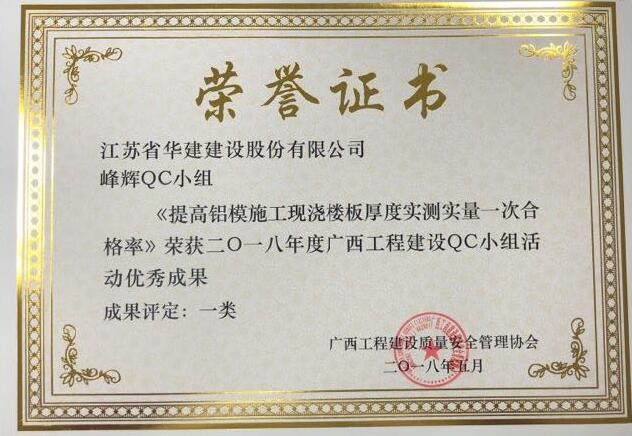 日前,北京公司有2項成果獲得省級表彰。蘋果QC小組“提高天棚輻射管道安裝一次合格率”榮獲天津市2018年度建設(shè)系統(tǒng)QC成果三等獎,峰輝QC小組“提高鋁模施工現(xiàn)澆樓板厚度實測實量一次合格率”榮獲2018年度廣西工程建設(shè)QC小組活動優(yōu)秀成果一類成果。