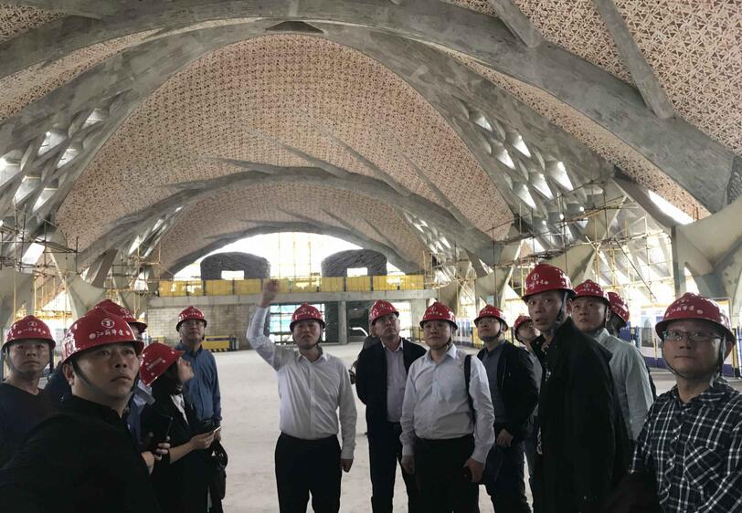 在瑪絲菲爾項目現(xiàn)場,雙方重點交流了藝術(shù)仿生建筑的超復(fù)雜結(jié)構(gòu)施工技術(shù)和廢舊建筑垃圾轉(zhuǎn)化為裝飾材料的綠色施工技術(shù)。