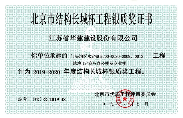 近日,北京市工程建設質量管理協會公布了2019-2020年度第一批北京市建筑結構長城杯獲獎工程名單,由我司承建的門頭溝區永定鎮MC00-0020-0009、0012地塊6#住宅樓及商業樓項目和門頭溝區永定鎮MC00-0020-0009、0012地塊12#商務辦公樓及商業樓項目均被評為2019-2020年度結構長城杯銀質獎工程。