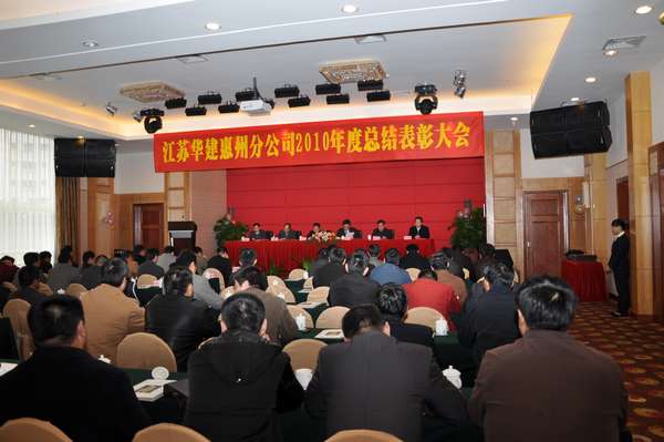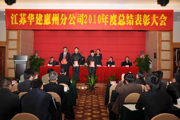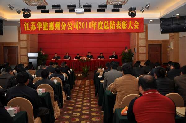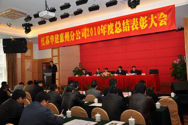 117,惠州金鑾酒店四樓會議廳,洋溢著一派喜慶祥和的氣氛。江蘇華建惠州分公司2010年度總結表彰大會在這里隆重召開。公司副董事長、總經理宗有農和副總經理兼總工程師程杰、副總經理林建華、總經濟師蔡華國等總部領導親臨大會。
