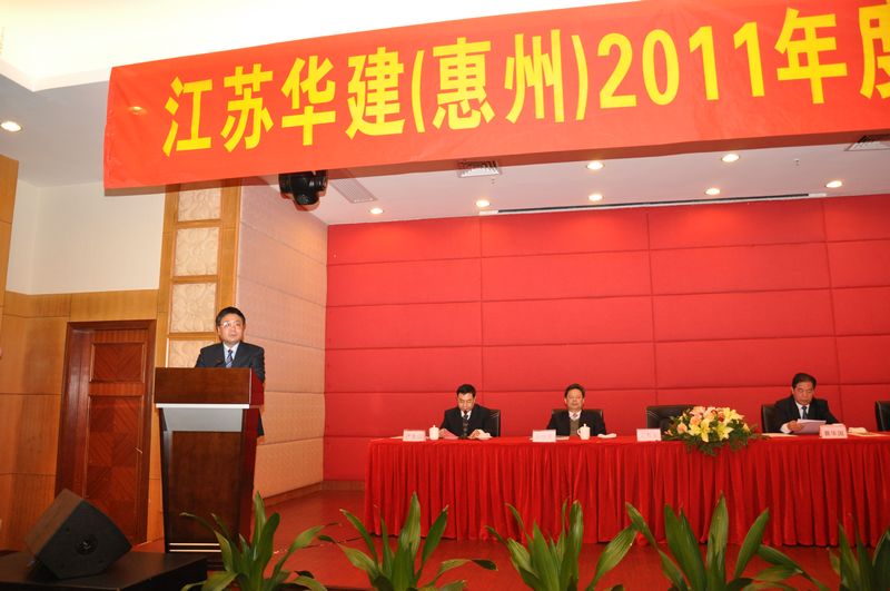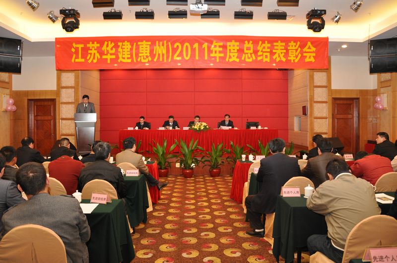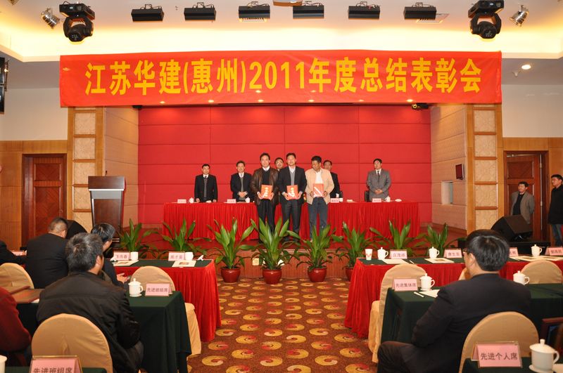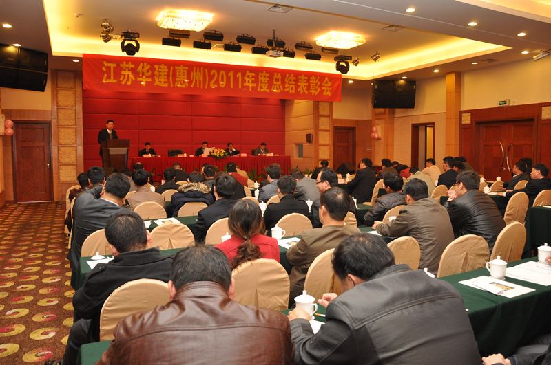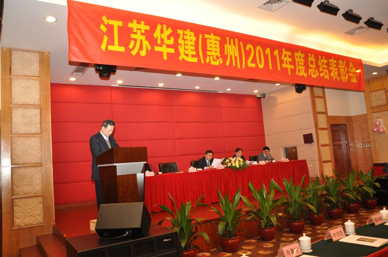 110,惠州金鑾酒店四樓會議廳,洋溢著一派歡樂祥和的氣氛。江蘇華建(惠州)2011年度總結表彰大會在這里隆重召開。公司副董事長、總經理宗有農、公司總經濟師蔡華國和惠州公司經營層等領導出席大會。